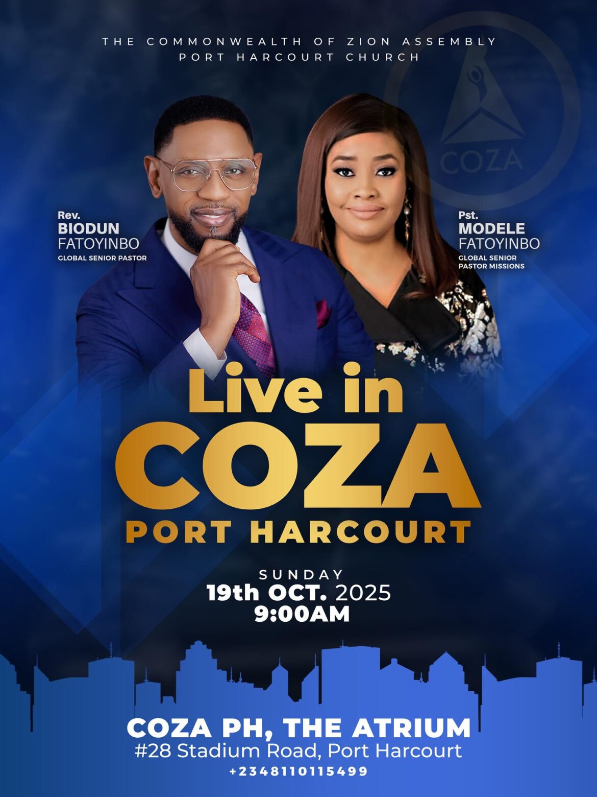 COZA Port Harcourt is set to host their global senior pastors, Rev Biodun and Pastor Modele Fatoyinbo, on Sunday, October 19th, and the city can’t stop talking about it. The anticipation is massive—members have been designing personalized flyers, flooding social media with posts, and Pastor Wole, the Executive Pastor, has already shared an official invitation video. The Port Harcourt online space is buzzing with excitement ahead of the visit.