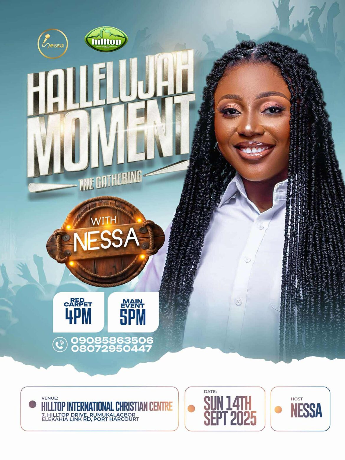 Nessa is set to lead Hallelujah Moment 2025: The Gathering in Port Harcourt on Sunday, September 14, 2025 — a night designed for deep worship, high praise, and life-changing encounters in God’s presence.