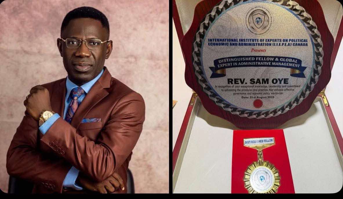 The Senior Pastor of The Transforming Church, Rev Sam Oye, has been conferred with the Distinguished Fellow & Global Expert in Administration Award by the International Institute of Experts on Political, Economic, and Administration (I.I.E.P.E.A), Canada.